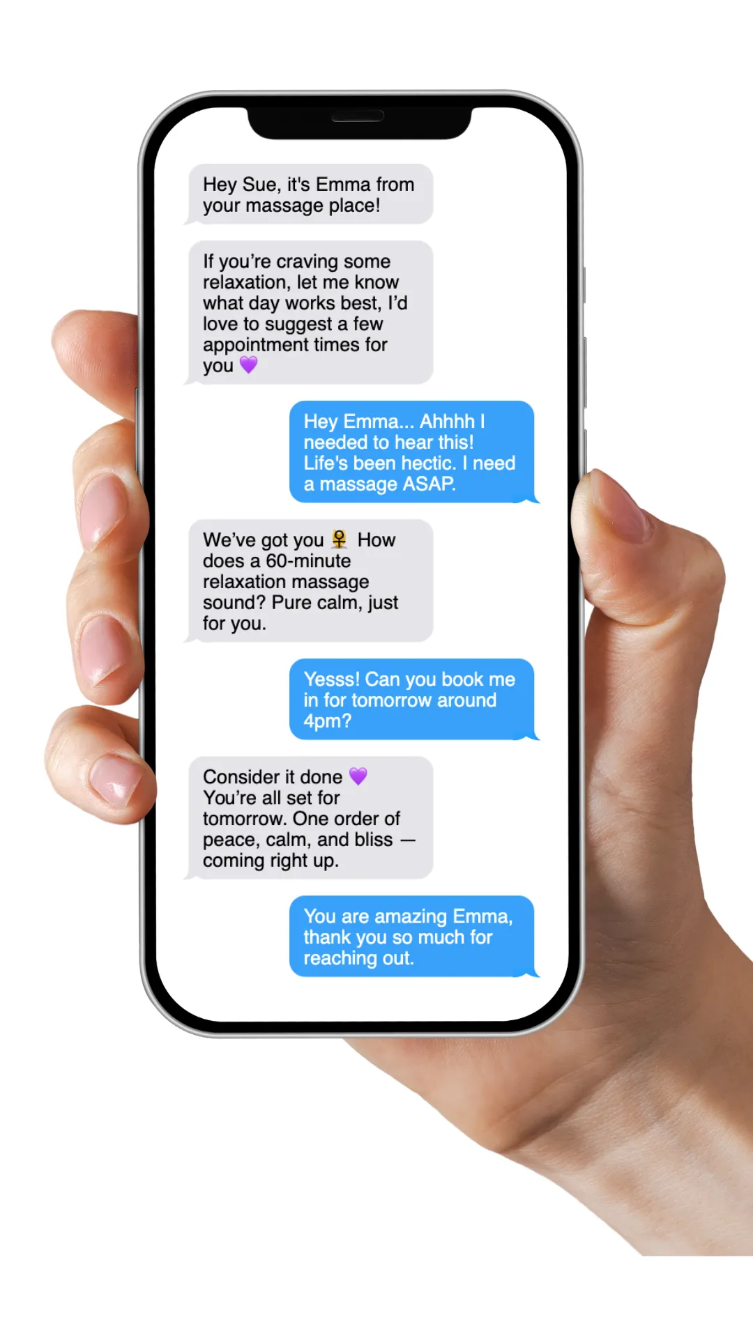 Emma answers when your team can’t, takes awkward recalls off your team’s plate and keeps conversations going until clients book again. Think of her as the extra set of hands that never gets tired.